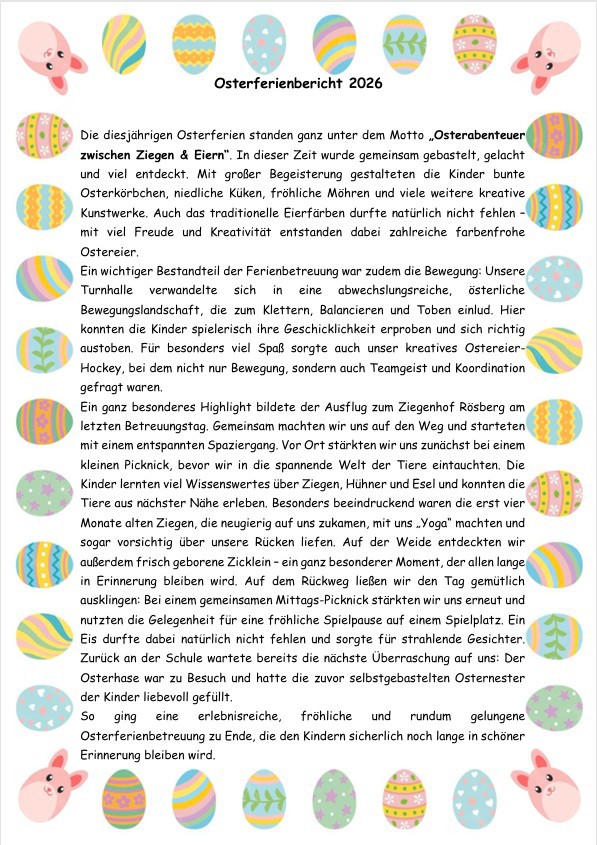 Osterferien in der OGS - „Osterabenteuer zwischen Ziegen & Eiern“.